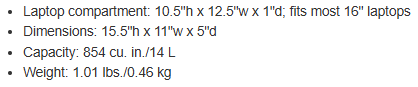 Information:Durable yet pliable, each Claremont bag is made to meet the many needs of the hybrid lifestyle head-on. It features sleek, modern details for an overall clean and elevated aesthetic. Fabric+Construction 65/35 polyester/cotton Features+Benefits Top carry handles Adjustable, convertible shoulder straps Spacious main compartment Expandable side pocket Matte metal zipper pulls and hardware Matte dyed-to-match coated zipper tape Weight+Measurements Laptop compartment: 10.5'h x 12.5'w x 1'd; fits most 16' laptops Dimensions: 15.5'h x 11'w x 5'd Capacity: 854 cu. in./14 L Weight: 1.01 lbs./0.46 kg Note: Bags not intended for use by children 12 and under